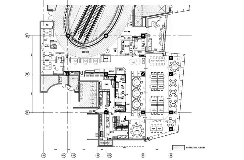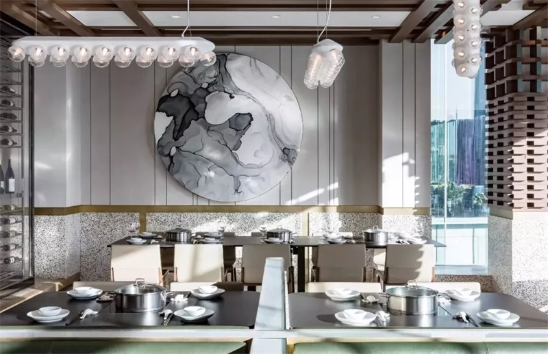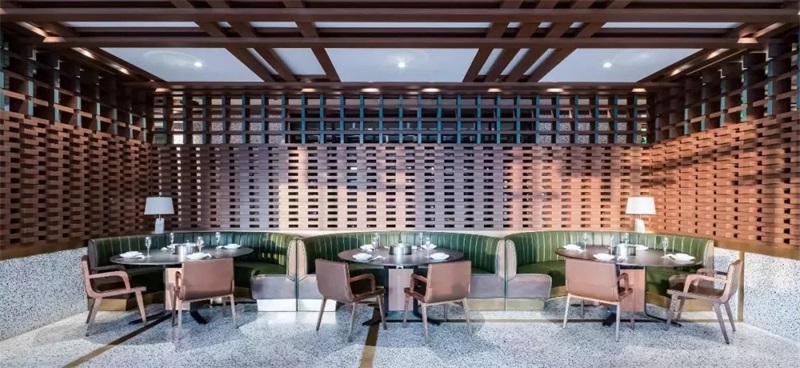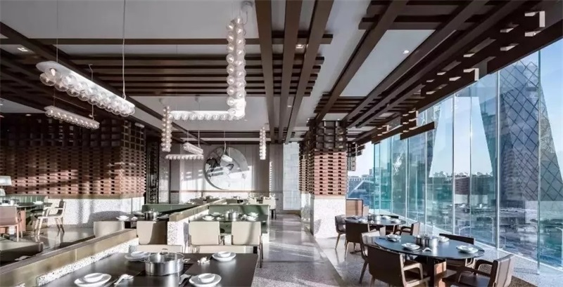 在設(shè)計之初我們就確定了以玻璃幕景觀區(qū)域為設(shè)計的切入點,利用原有的下沉空間把餐廳設(shè)計成一個微縮小劇場,以玻璃幕區(qū)域為最低點向內(nèi)部空間依次抬高,并形成三個劇場式臺階,那麼在不同高度上就餐的人們就能更好的欣賞到三環(huán)美景,其他的剩余空間較為私密正好作為包間使用同時也提高了零散空間的使用效率。