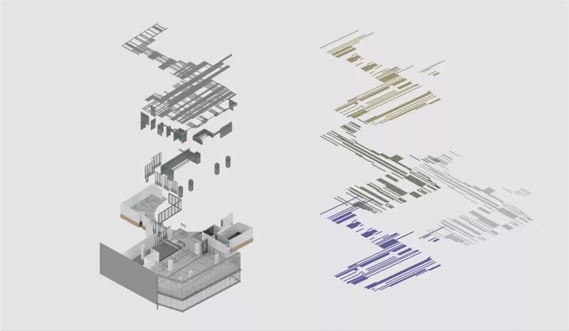 另外值得一提的就是餐廳的外立面設(shè)計,原來的紅線是半弧形曲線,如果按照原來的形狀立面效果勢必被平面化,也不能與內(nèi)部空間有機結(jié)合,所以我們以退為進把弧線轉(zhuǎn)化成折線,這樣一來就能讓原本平淡的立面變得多變且負有韻律感,同時利用時空轉(zhuǎn)化關(guān)系延長了外立面的長度無形中增加了餐廳的展示面。