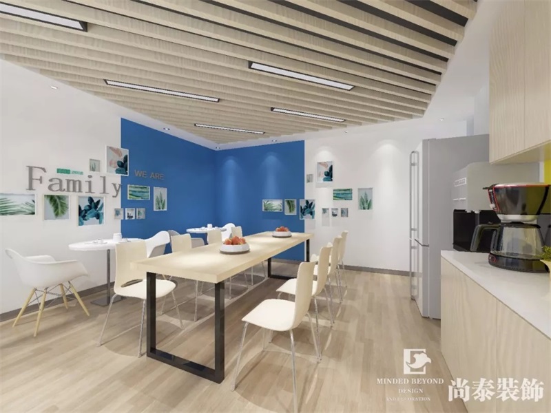 主要用以員工休息和放松用餐的區(qū)域,所以留白處增添了不少綠色,一是緩解長期盯著電腦的視覺疲勞,二是除了工作更有舒適的生活體驗(yàn)。