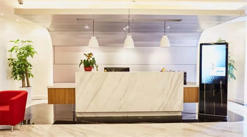 前臺(tái)主要采用了大面積的大理石來做點(diǎn)綴,在視覺上給人一種高端大氣的即視感,同時(shí)在燈光上采用柔亮的色系,符合當(dāng)下人群的心理需求。