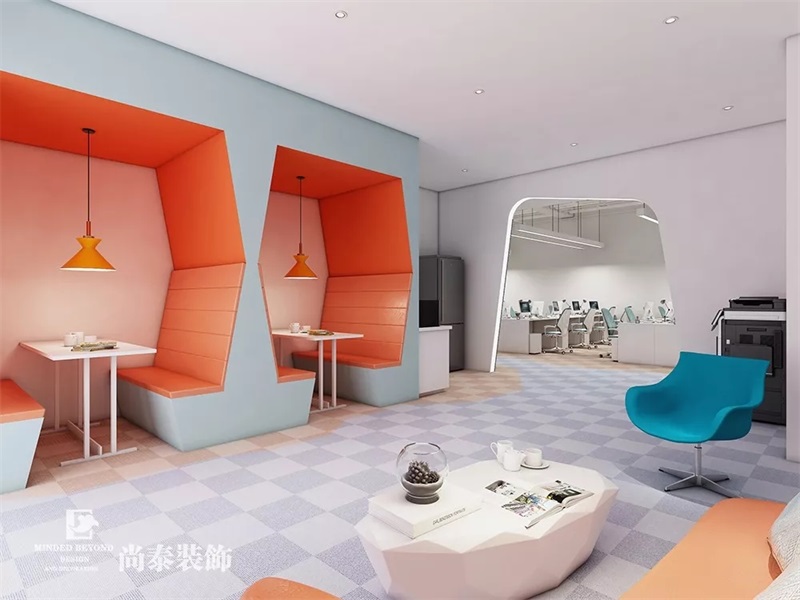 開放辦公區(qū)域作為整體員工工作區(qū)域,為了保證員工的舒適性,提高員工工作效率,天花板采用loft風(fēng)格的吊頂,白熾燈裝飾,地磚采用格子紋的材料,而且采用暖色調(diào),整體營(yíng)造的氛圍然人感覺(jué)很舒服。