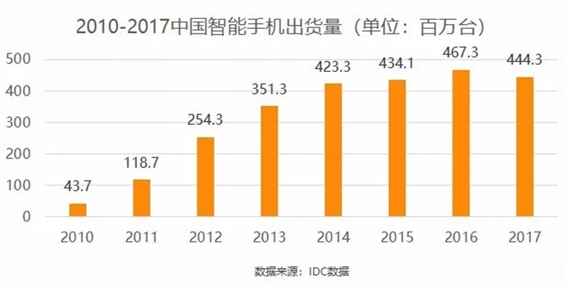 根據數據顯示,2016 年中國智能手機出貨量達到高峰共計出貨 4.673 億部,而 2017 年中國智能手機出貨量減少了將近 5%,出貨量為 4.443 億部。