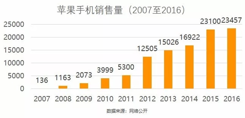 通過上面這張圖,我們可以看出截止至 2017 年,智能手機高速增長的時代已經結束了,產品的出貨量已經開始下降。