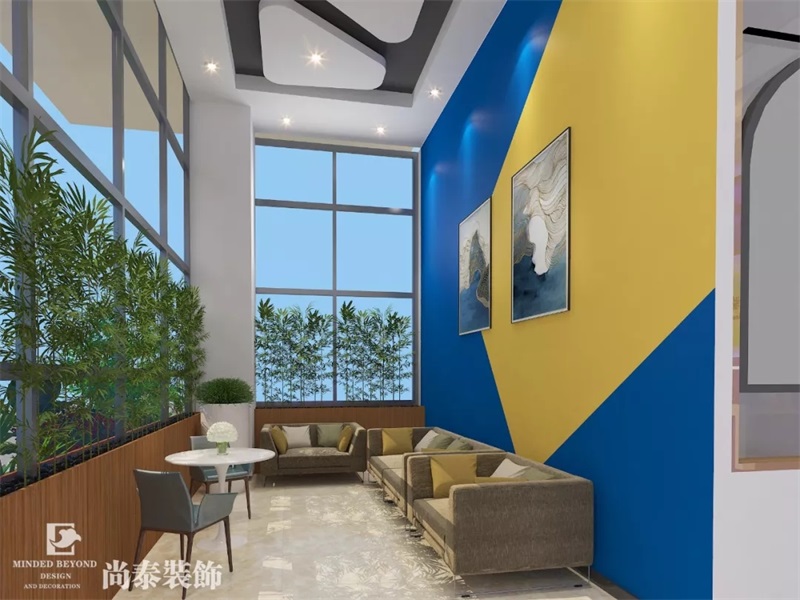 休息區(qū)作為員工休息的地方,在視覺上必須要先考慮舒適和放松的目的,采用了色彩的布藝家具,不僅滿足了使用舒適性,同時(shí)也達(dá)到了視覺上的效果。