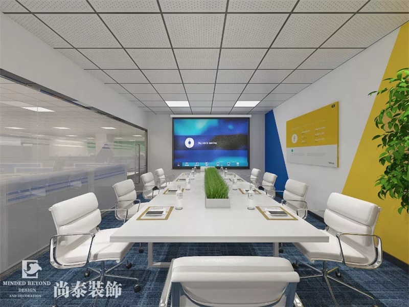 會議室作為一個(gè)集中和接待的區(qū)域,主色帶采用了白色,另外通過藍(lán)色和黃色作為點(diǎn)綴,在布置方面顯得更加大氣,同時(shí)強(qiáng)調(diào)了對空間的儀式感。