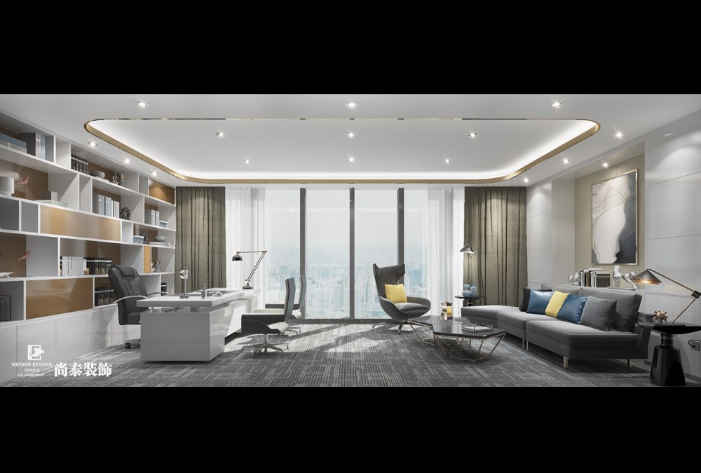 董事長(zhǎng)辦公室,天花主要采用造型天花作為裝飾跟照明,地面采用滿(mǎn)鋪造型地毯一方面提升檔次,一方面保證空間的舒適度,墻面采用背景柜結(jié)合木飾面的組合營(yíng)造出氛圍,家具采用現(xiàn)代或者實(shí)木家具,凸顯檔次。