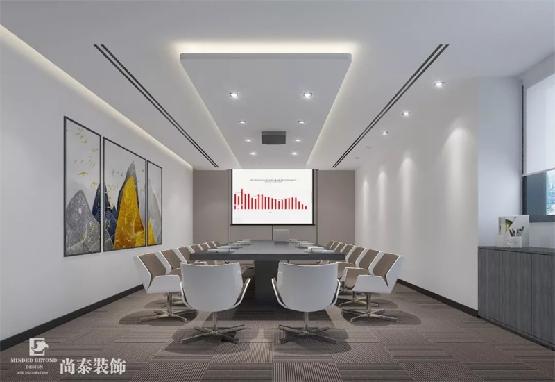 地面使用棕色的地毯來穩(wěn)定空間的作用和減低在開會時候人員的出入的聲音。把投影藏在天花上面,在需要使用的時候才放下來,靠窗的采光使室內(nèi)和室外都相互連接在一起,但是又能相互的分隔這空間,因此裝飾較為簡單。