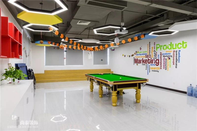 茶水間相對就設計上要溫馨一些,暖黃色的座椅會讓人放松下來,不規(guī)則的鏤空吊頂更是充滿時尚感,地面干凈整潔,給人一舒適的體驗,絲毫不亞于咖啡廳!還有臺球娛樂,帶動全公司的熱情。