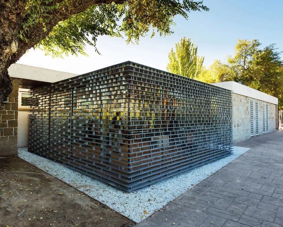 這座涼亭位于西班牙一棟行政大樓的開放式后院中,設(shè)計(jì)師想將現(xiàn)有建筑與自然環(huán)境完美地融合在一起,于是設(shè)想了一個(gè)簡單的由玻璃圍合起來的方形盒子。這座酷似格柵形式的涼亭由水平和垂直的鋼片組成,內(nèi)部用透明的玻璃將空間圍合起來,在保護(hù)了室內(nèi)私密性的同時(shí)還保持了空間的通透性,兩全其美了。