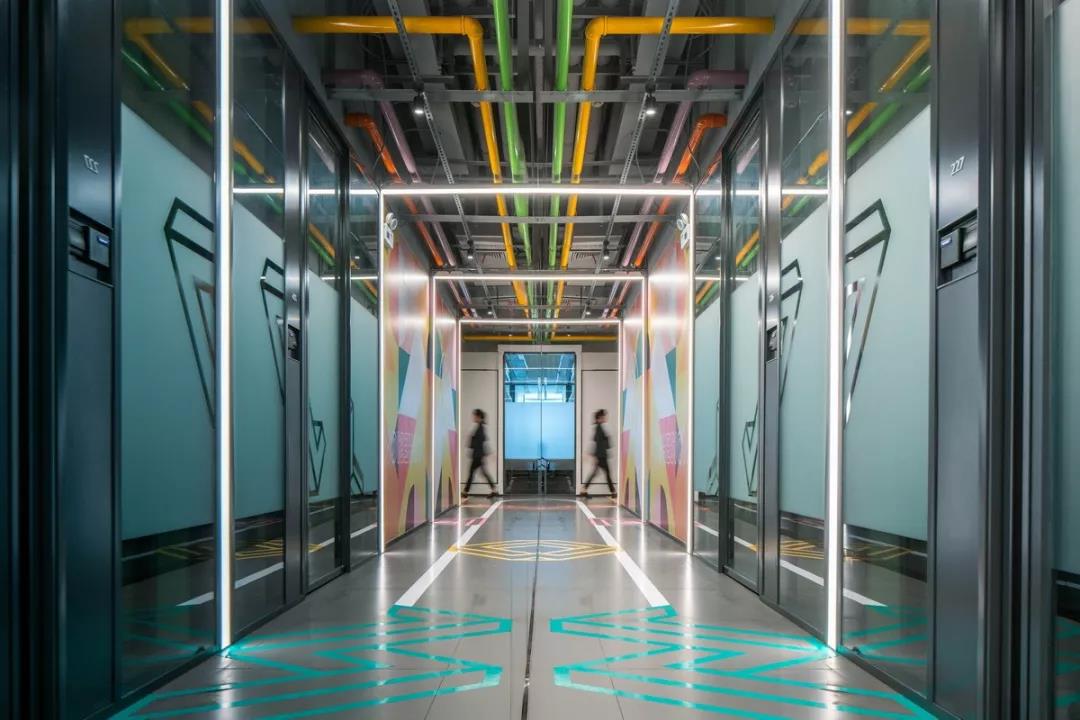 這是一個用光線、鏡子和幾何色塊組合而成的走廊通道。色彩、幾何、線條都在這個空間里被巧妙運用,天花板、墻壁、地板三個方面都被兼顧到了。整個空間既有層次感和線條感,又帶給人趣味感和活潑感,有點像一個游戲賽道!