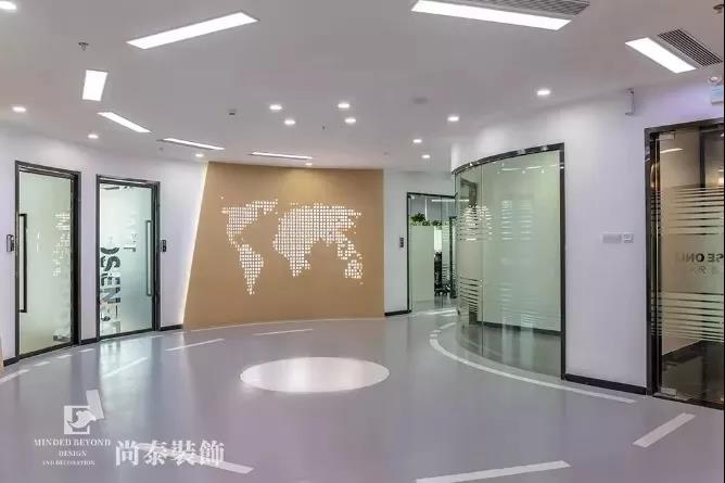 由尚泰裝飾集團打造的該辦公通道采用了曲線的燈帶設計和人行道模擬設計,都體現(xiàn)了企業(yè)提倡靈活、自由變換的思維模式。墻壁上的全球五大洲地圖,展現(xiàn)了該公司面向全球、走向世界的企業(yè)信心!