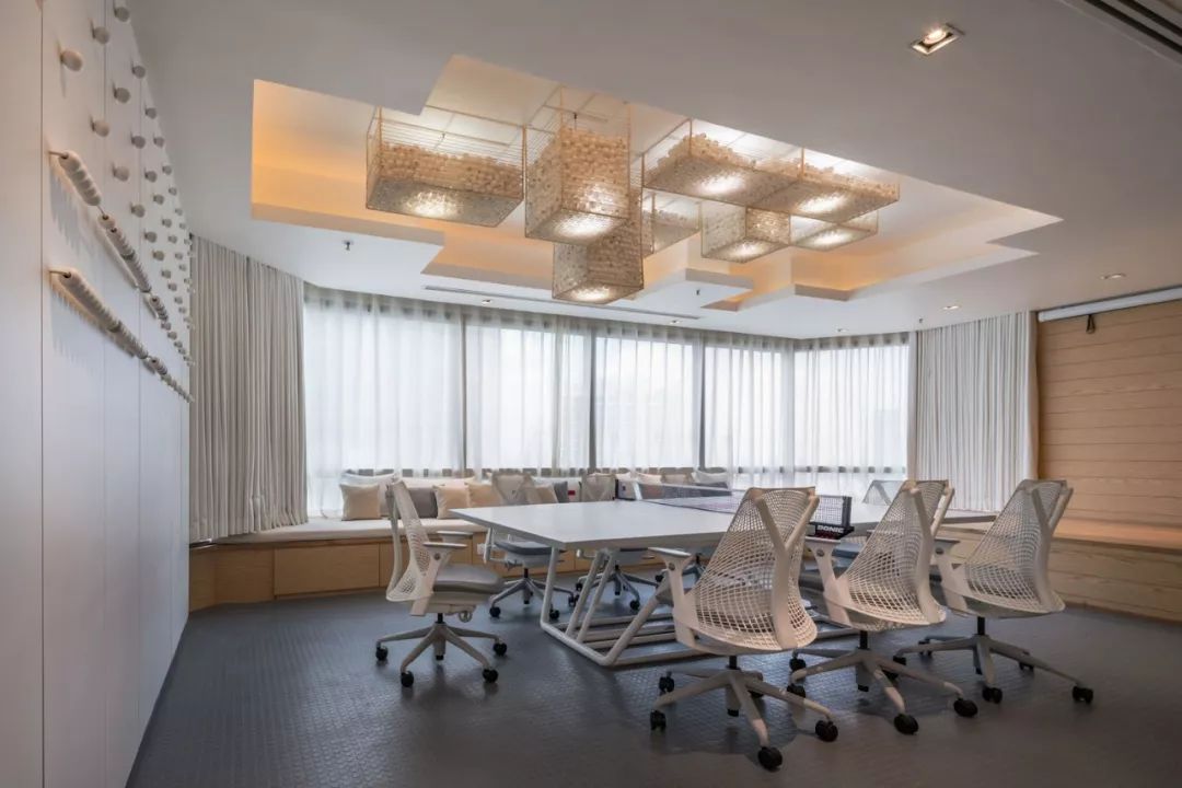 在這個(gè)辦公空間里,所有的功能區(qū)域,都是采用內(nèi)嵌式的房間設(shè)計(jì)。會(huì)議室采用了透明玻璃鏡,采光性很好,白色和木色搭配的空間,要多舒適有多舒適。會(huì)議室的桌子除了辦公用,還是一臺(tái)乒乓球桌,給員工們準(zhǔn)備的娛樂運(yùn)動(dòng),桌子上方是裝滿了乒乓球的容器燈,墻上的乒乓球既可以做裝飾品又可以用來比賽計(jì)算,好看好玩不是說說而已。
