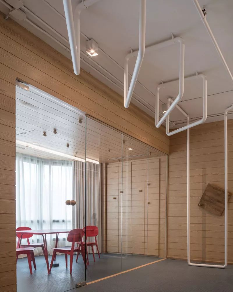 這里的墻壁都是采用橫條的木板鋪就,落地玻璃鏡隔離讓空間既視野通透又采光極佳,同時(shí)保持了空間紋理和空間舒適度。