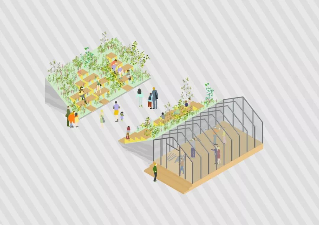 這個(gè)辦公室具有一個(gè)具有綠化表皮的階梯狀的長(zhǎng)椅,除了為辦公人員提供休息功能之外,還作為城市長(zhǎng)椅來使用,城市里的任何一個(gè)人都可以使用,這大大加強(qiáng)了該辦公裝置與環(huán)境的聯(lián)系,辦公人員可以在這里開會(huì)議、曬太陽休息,還可以和市民們聊天,這真的是太棒了!