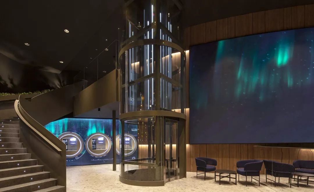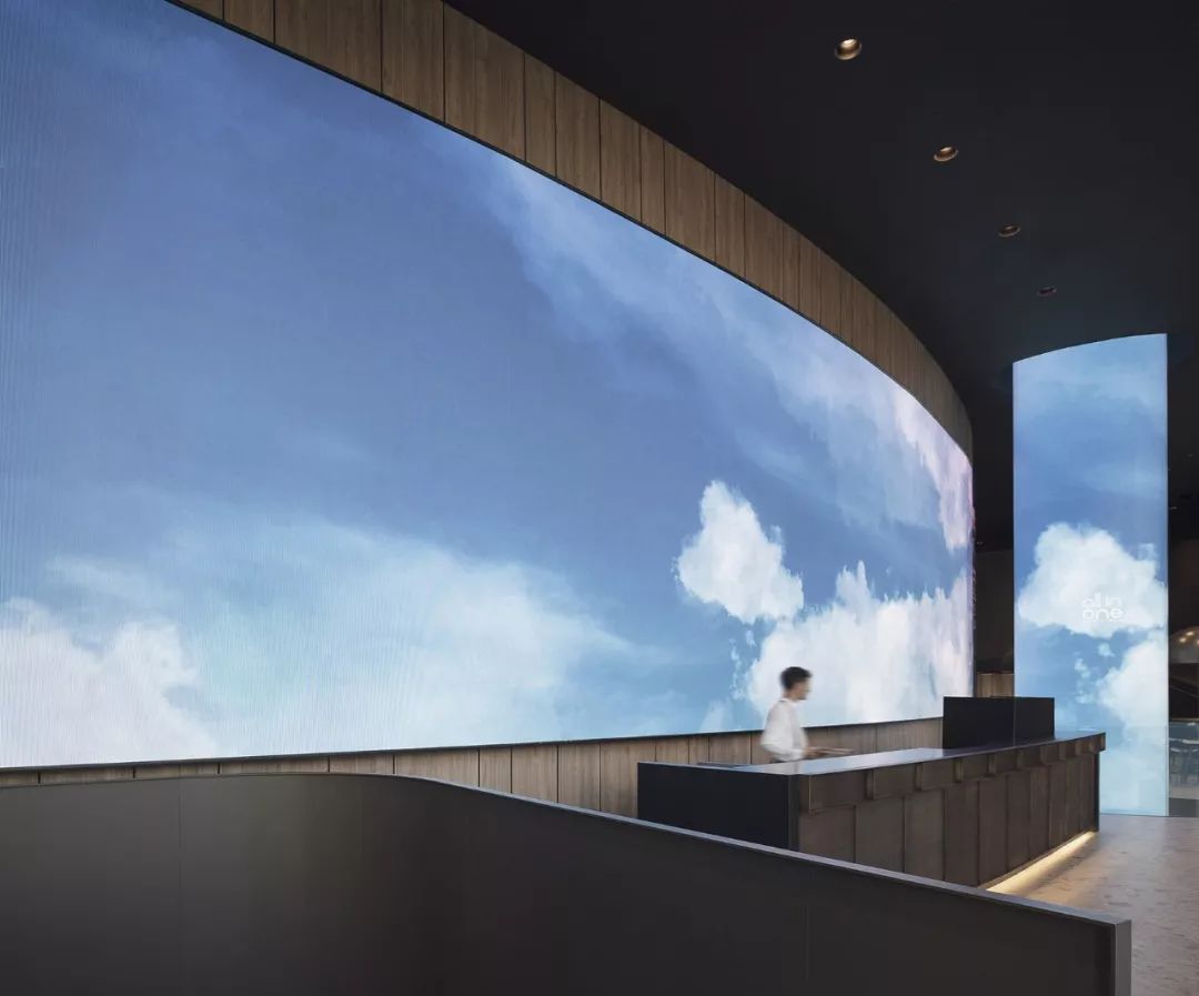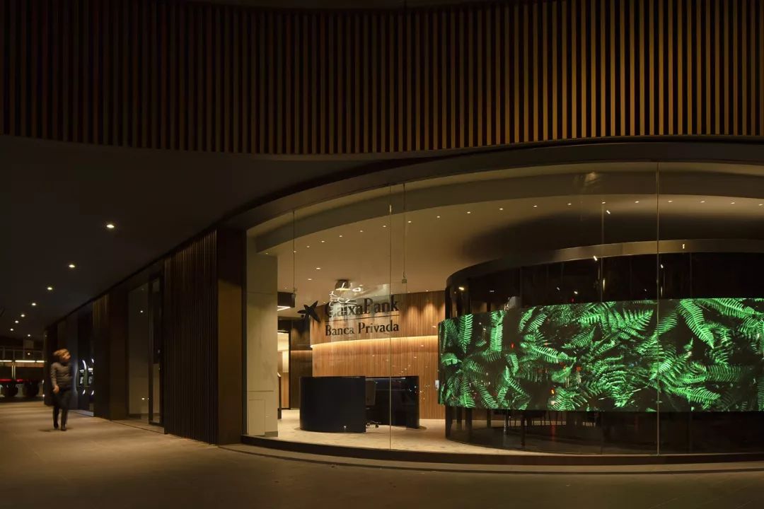 大屏LED屏幕的前臺,在西班牙一家銀行辦公室的大廳里,前臺是由黃銅打造而成,顏色單一形式簡潔,背后一面弧形的LED大屏,不間斷地呈現(xiàn)綠植等自然元素的影像,從而將自然景觀引入室內,給人們送來清爽的慰藉。