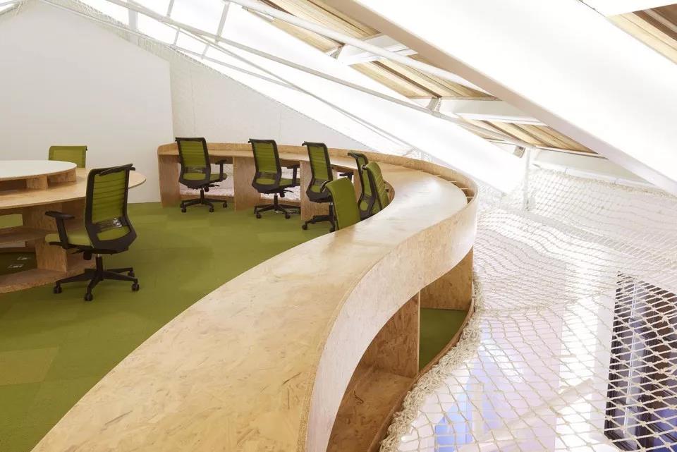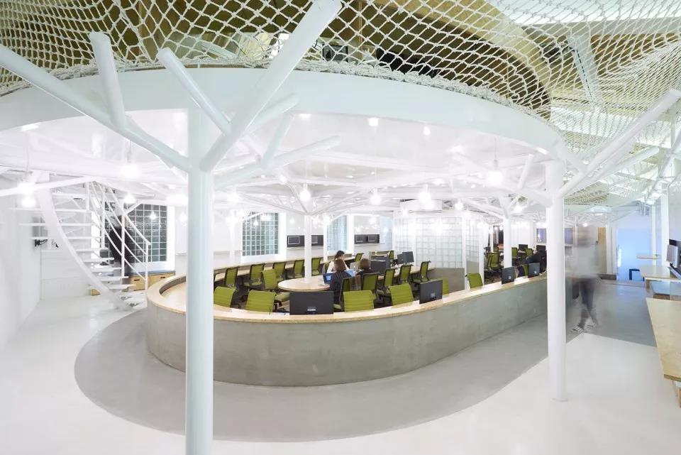 這是一家IT公司的辦公室設(shè)計,里面容納了多樣的交流辦公方式,讓員工的辦公生活靈活且有趣。空間內(nèi)的柱子呈現(xiàn)出樹木的枝椏狀,上面的網(wǎng)狀隔離用作休息空間,這種休息設(shè)計真是刺激又有創(chuàng)意!
