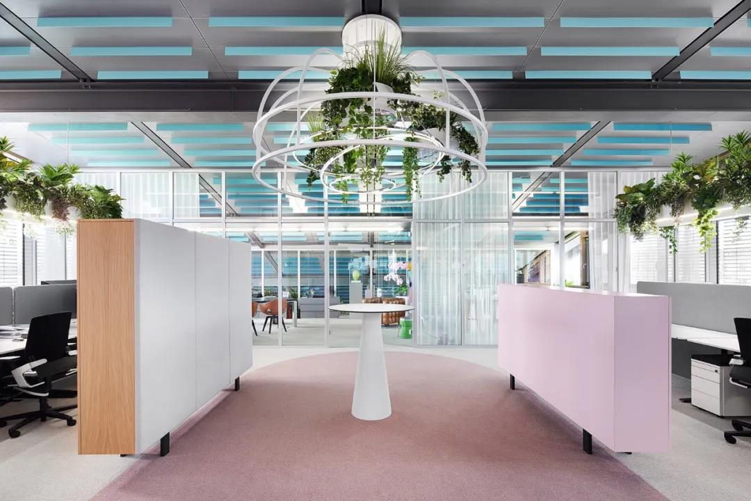 辦公區(qū)的中庭通道,采用了粉紅色的橢圓形構(gòu)建不同的空間層次,綠植設(shè)計(jì)也相應(yīng)地做了不同形式的設(shè)計(jì):辦公區(qū)的直線型和通道上的圓形罩房式組合,給人的空間內(nèi)容更多,樣式更豐富。另在天花板上用彩條作裝飾,漸變色的處理讓空間在區(qū)域功能上呈現(xiàn)完美的轉(zhuǎn)變,創(chuàng)建出新的空間深度。