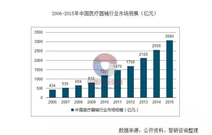 我國是人口大國,醫(yī)療器械行業(yè)屬于國家重點支持的戰(zhàn)略新興產(chǎn)業(yè),發(fā)展前景廣闊。伴隨著經(jīng)濟的快速發(fā)展,我國醫(yī)療器械行業(yè)增長迅速,市場銷售規(guī)模由2006 年的 434 億元增長到 2015 年的 3,080 億元,但醫(yī)療器械產(chǎn)業(yè)依舊存在較大的市場缺口,未來醫(yī)療市場空間依然廣闊,主要驅(qū)動因素有以下幾個點: