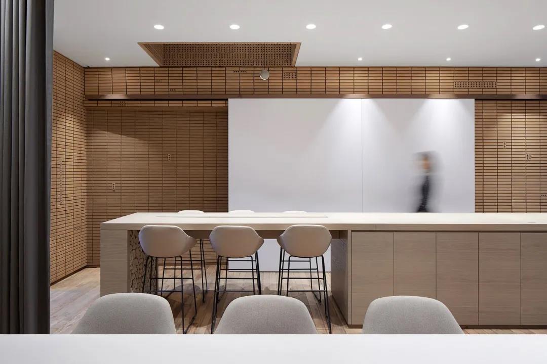 磚墻從一樓延伸到二樓,使得較為狹窄的門戶更具有立體縱深感,形成空間中的視覺焦點(diǎn)。茶水間的磚墻又與其他的不同,相同的大小,統(tǒng)一樣式地整齊排列著,形成平整的空間紋理,沒有凹凸不平,看上去更為精致、細(xì)膩一些,給人傳達(dá)出溫暖細(xì)致的品牌質(zhì)感。茶水間整體吧臺設(shè)計是隱藏式的,想象不到的是,水槽、垃圾收納、冰箱、烤箱、會議線槽等功能都在這里面進(jìn)行了融合。這樣的設(shè)計既提高了整體空間的視覺美感,又實現(xiàn)了多功能的使用情景。