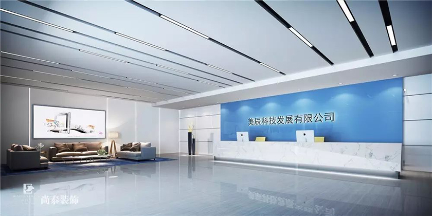 前廳以象牙白為主色調(diào),簡(jiǎn)單有力的造型、恰到好處地展現(xiàn)了美辰科技的品牌文化和創(chuàng)造力。