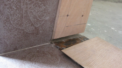 門套基層防潮工藝: 新建隔墻與地面的濕度不一樣,現(xiàn)場制作門套時(shí),需要在門套與新建 墻體間設(shè)置防潮膜、噴涂木材防水劑,廚房、衛(wèi)生間的門套基層板需 要離地15mm以防止水氣侵蝕 |