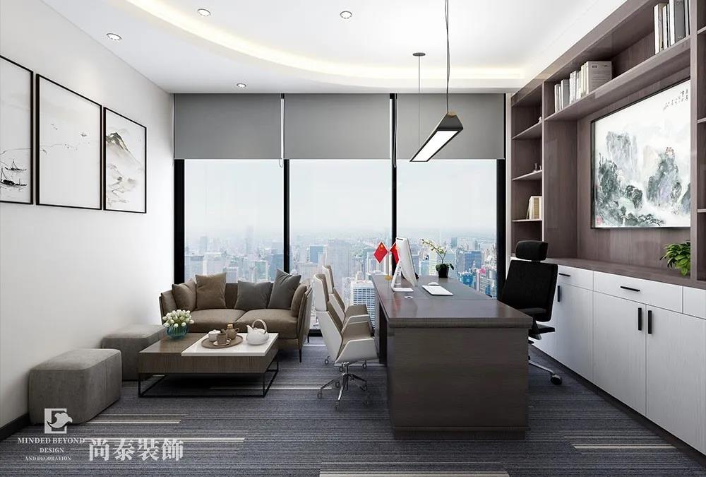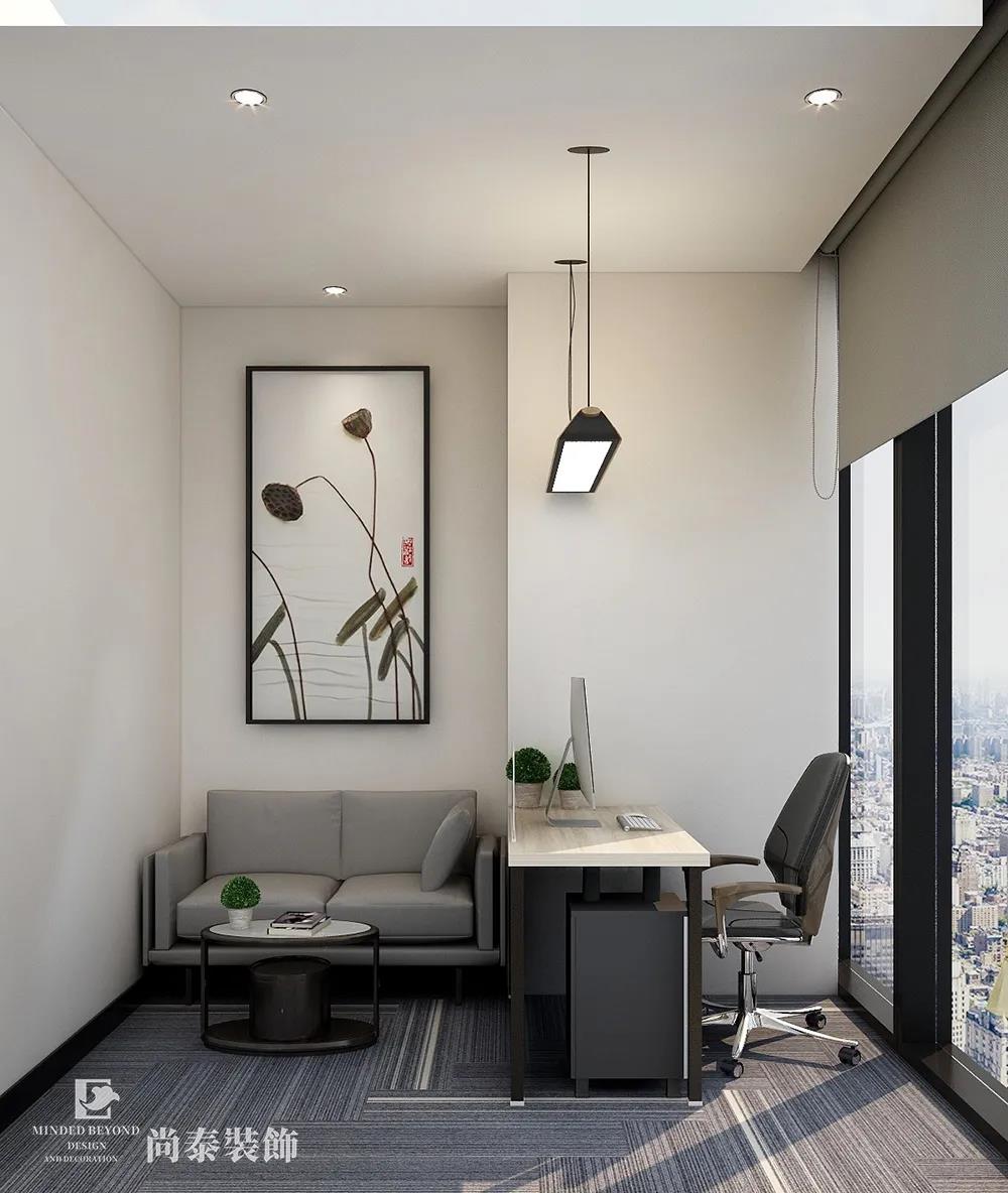 受囿于小辦公室“空間小“的特點,董事長室大膽使用線條,做出縱深感。天花采用吊頂,家具采用高柜,落地玻璃窗延展空間深度,窗外世界一覽無余,黑色邊框水墨畫延伸空間長度,灰色紋理地毯中白色線條的合理編排拉長了視覺寬度,整個設計在視覺上給人很強的縱深感。