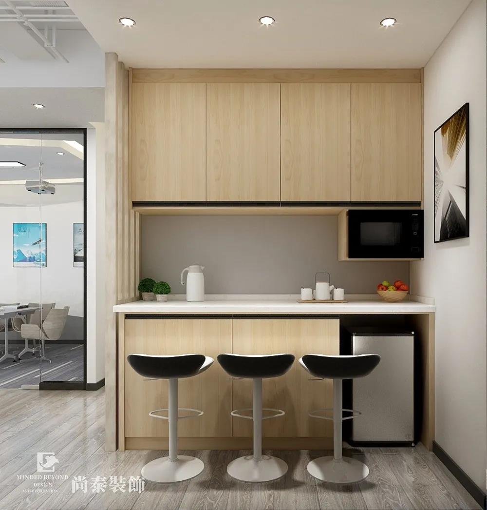 茶水間采用木飾面柜體,搭配高腳凳,營造輕松自然的休閑氛圍。在這個空間為了突出亮點,設計師著重使用點光源,滿足員工飲水時的照明需求。
