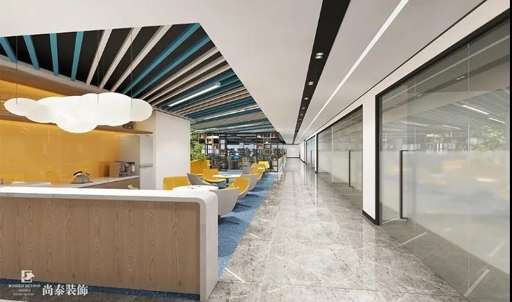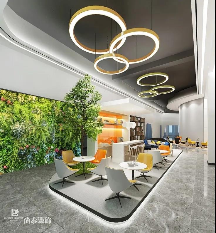 休閑區(qū)的設(shè)計,最能體現(xiàn)公司年輕活力,科技前沿的企業(yè)文化屬性。設(shè)計以黑白灰為主色調(diào),配以黃橙色等活潑色彩,加上獨具創(chuàng)意的天花和地面造型,為員工營造出年輕活潑、自由愜意的休閑空間。