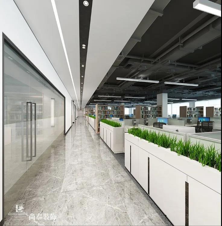 開放式辦公空間采用卡位布置,加上造型和燈光點綴,使空間寬敞明亮。