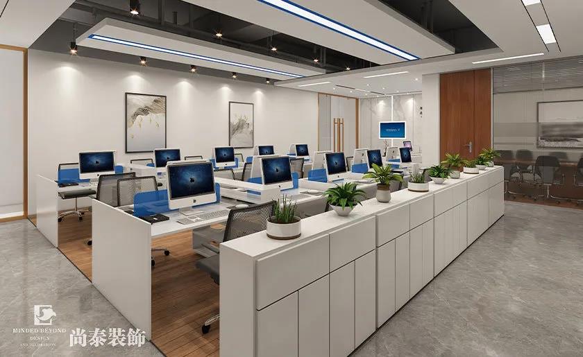 開放辦公區(qū)地面采用復(fù)合木地板,墻面刷上白色乳膠漆,天花使用白色乳膠漆的同時(shí)以一絲藍(lán)色乳膠漆點(diǎn)綴。以白色辦公家具裝飾空間,為員工營造一個(gè)干凈舒適、方便高效的辦公環(huán)境。