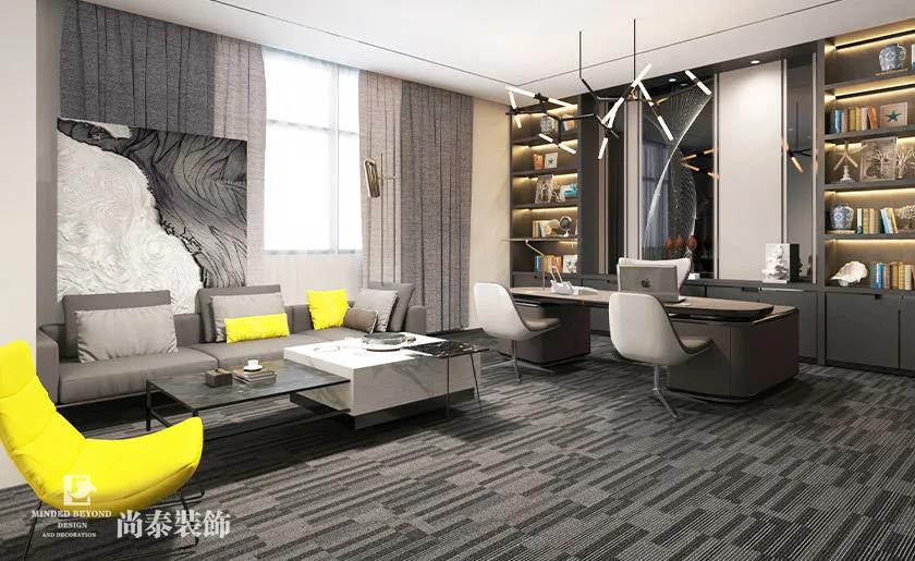 老板辦公室室整體色調(diào)以黑白灰為主,輔之以一些細(xì)節(jié)跳躍色(亮黃色)進(jìn)行點(diǎn)綴,搭配冷系燈光,營造明朗舒適的空間氛圍,突出現(xiàn)代時尚感。