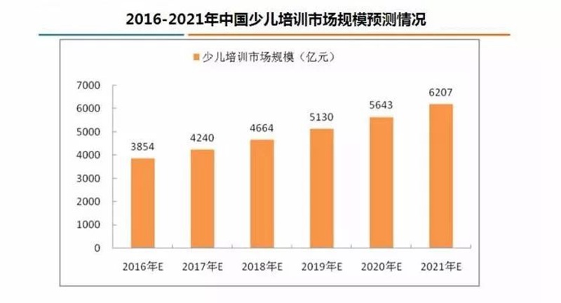 少兒培訓(xùn)已成為名副其實(shí)的“朝陽(yáng)產(chǎn)業(yè)”,其市場(chǎng)逐漸成為一塊令人垂涎的大蛋糕。未來幾年,該領(lǐng)域依然呈現(xiàn)快速增長(zhǎng)的趨勢(shì),中商產(chǎn)業(yè)研究院預(yù)測(cè),2016年中國(guó)少兒培訓(xùn)市場(chǎng)規(guī)模超過3800億元,保守估計(jì),每年將會(huì)以10%的速度增長(zhǎng),到2021年,中國(guó)少兒培訓(xùn)市場(chǎng)規(guī)模將突破6000億元。