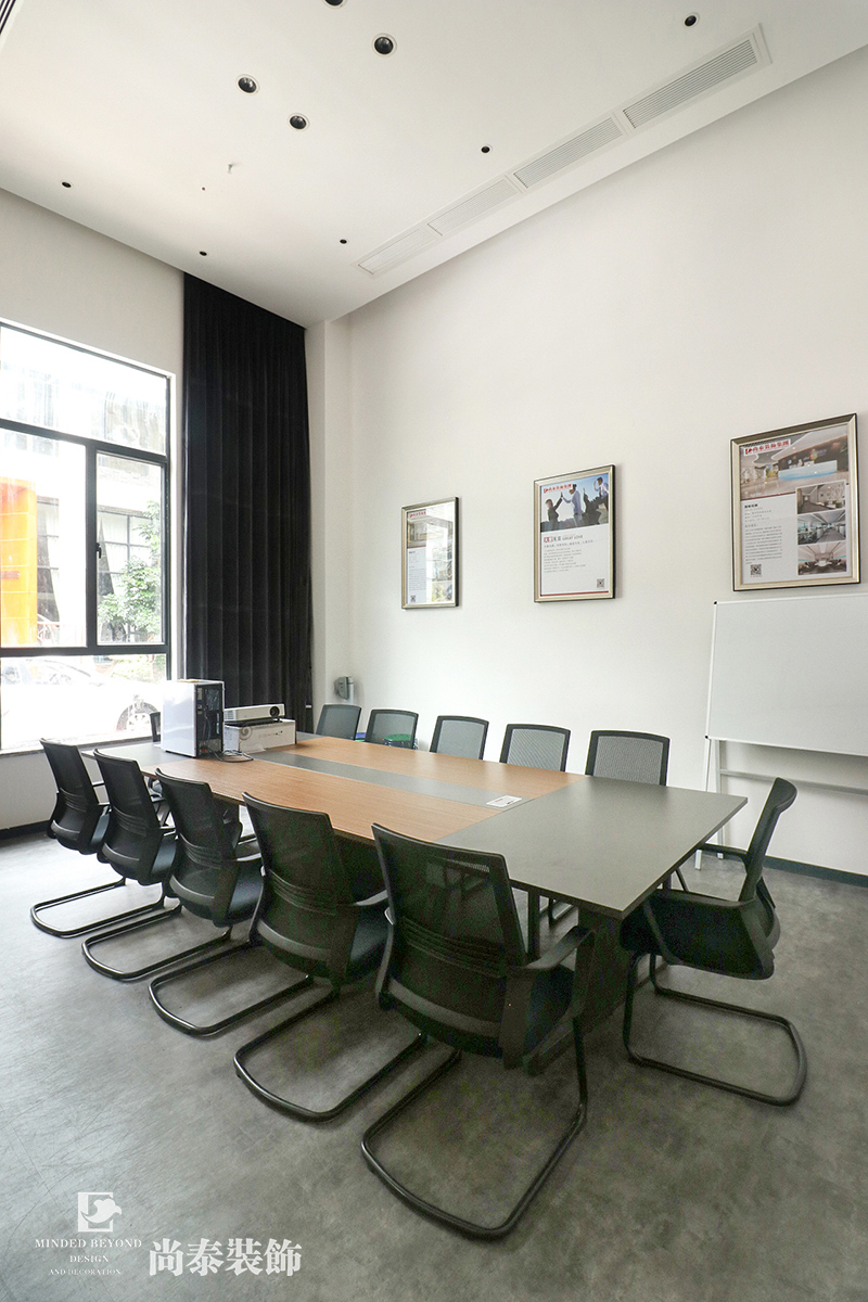 會議室,應該是比較嚴肅的地方,既要做到物盡其用,也要簡潔大方,墻體采用白色乳膠漆油刷,墻面上有壁掛,顯得不那么單調,也給會議室增添了一絲的畫意,地板采用灰暗的色調,與白色的墻面與房頂剛好形成強烈的對比。