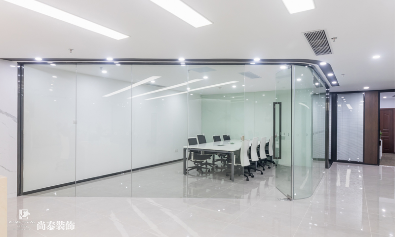 會議室裝修實拍圖,是一個除了正常辦公之外,待的最久的一個空間,早上有晨會,每周有周會,還有月會,季會等等,本設計采用白色為主色調,為了契合整個空間的色調,用玻璃作為隔斷,給人一種空曠、明亮的感覺,最大程度的減輕了員工的壓力。