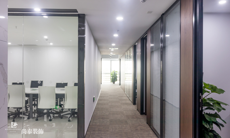 走廊裝修實拍圖,左右兩邊分別是會議室,辦公區(qū),明亮的燈光,地面也采用地毯,也到達防滑的效果,遠處的綠植達到引領的裝飾作用。