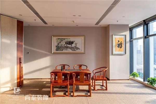 老板辦公室屬于公司決策型人才的辦公空間,設(shè)計風(fēng)格又跟開放辦公的活潑不同,采用了較為沉穩(wěn)的中式風(fēng)格,象征著掌權(quán)者沉穩(wěn)冷靜、運籌帷幄的性格特點,在空間裝飾中加入了中國文化元素,給空間增添傳統(tǒng)文化哲學(xué)的底蘊美。