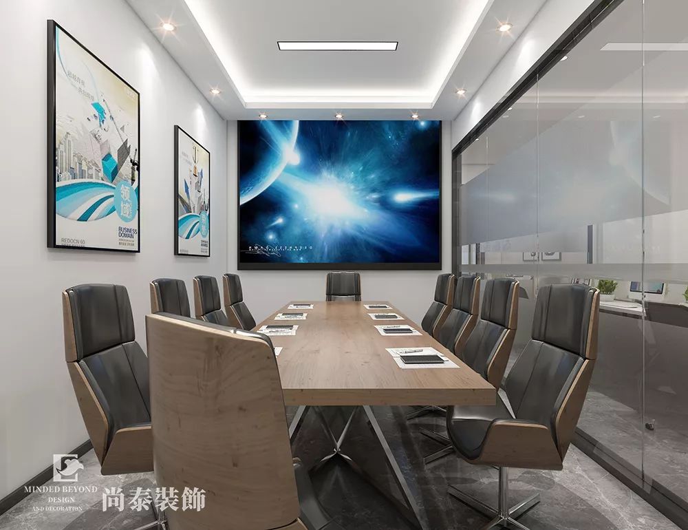 開放辦公區(qū)是和會議室兩個區(qū)域用透明玻璃鏡隔開,中間橫條阻隔了視線,使得兩邊視線既通透又有阻斷。會議室和開放辦公區(qū)都是狹長型,天花板燈飾的點、線設(shè)計,符合量與量之間按比例、成直線的線性關(guān)系。