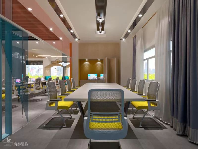 會(huì)議室橘黃色的座椅、紅白相間的鐵格柵和藍(lán)色的隔斷玻璃,整個(gè)空間活潑靈動(dòng)。