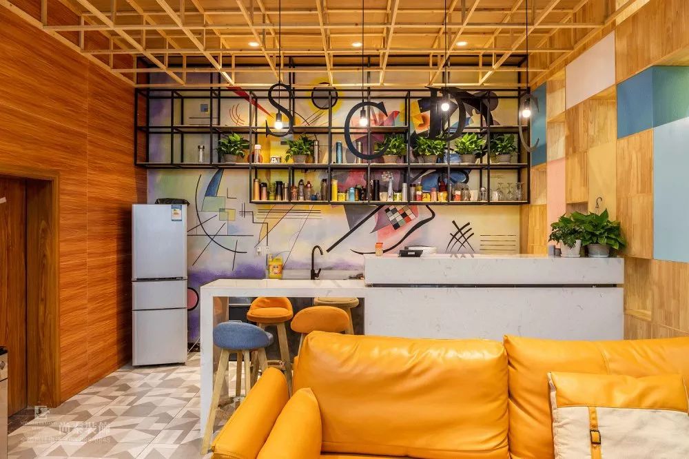 茶水間的設(shè)計(jì)采用了方正結(jié)構(gòu)的鐵藝置物架,背景墻則運(yùn)用了充滿(mǎn)藝術(shù)感的藝術(shù)噴漆畫(huà),右側(cè)墻面同樣是顏色不一的四方形體塊,空間既整合統(tǒng)一又多樣化。