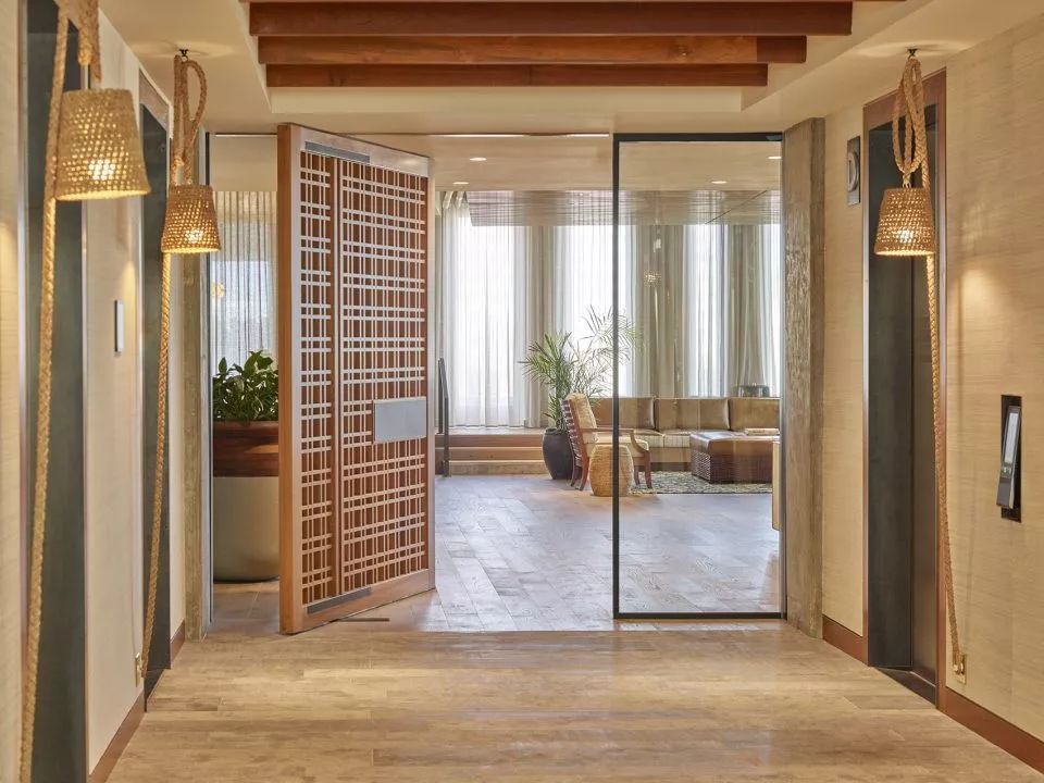 繩索吊燈的淡雅燈光下,木格柵的推門顯得尤為典雅,待客區(qū)搭配棕色和淺灰的沙發(fā),復(fù)古花紋的地毯,高貴典雅的氣質(zhì)立馬呈現(xiàn),生機怏然的綠植在墻角里散發(fā)其特有的藝術(shù)氣息。編織的藤蔓和繩索帶有一種復(fù)古、做舊的藝術(shù)氣質(zhì),這一辦公主人對于編織的喜愛,從門口的繩索吊燈就可以窺見一二,現(xiàn)在發(fā)現(xiàn)休閑區(qū)的繩索吊燈裝飾和室外露臺的編織用品等,更可以驗證??臻g里到處都散發(fā)著簡約高貴、舒適休閑的氣息。