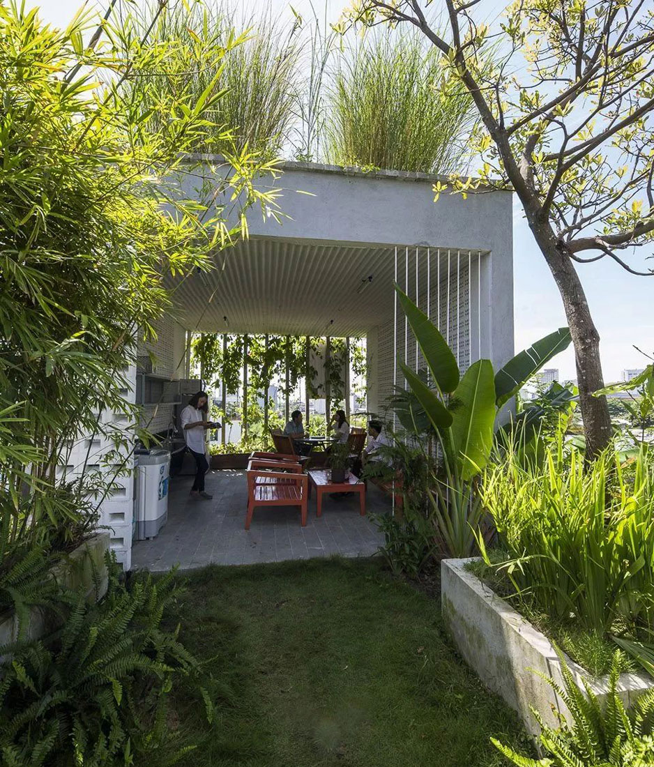 隱匿在一片綠色中的辦公室,白色的磚墻,簡單的水泥地,一切都像是記憶中的鄉(xiāng)村模樣。雙排孔洞給空間增添了豐富的紋理元素,無處不在的綠植讓人感覺神清氣爽,與摸不透風(fēng)的城市建筑不同,這棟辦公室不需要依賴空調(diào)就可以讓室內(nèi)處處透著清涼。