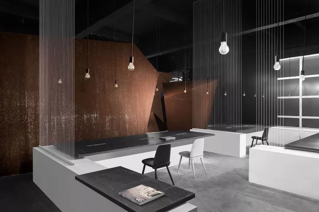 重金屬工業(yè)風(fēng)辦公室裝修時(shí)把空間放空,置入活力,辦公區(qū)的黑與白,遵循了空間原有的簡(jiǎn)單,穿插在空間內(nèi)的金屬體塊,又讓空間具有了趣味性。從天花板垂下至桌面的白色細(xì)線隔離,給“硬漢”金屬風(fēng)的空間,增添了一絲柔和優(yōu)美的氣息。