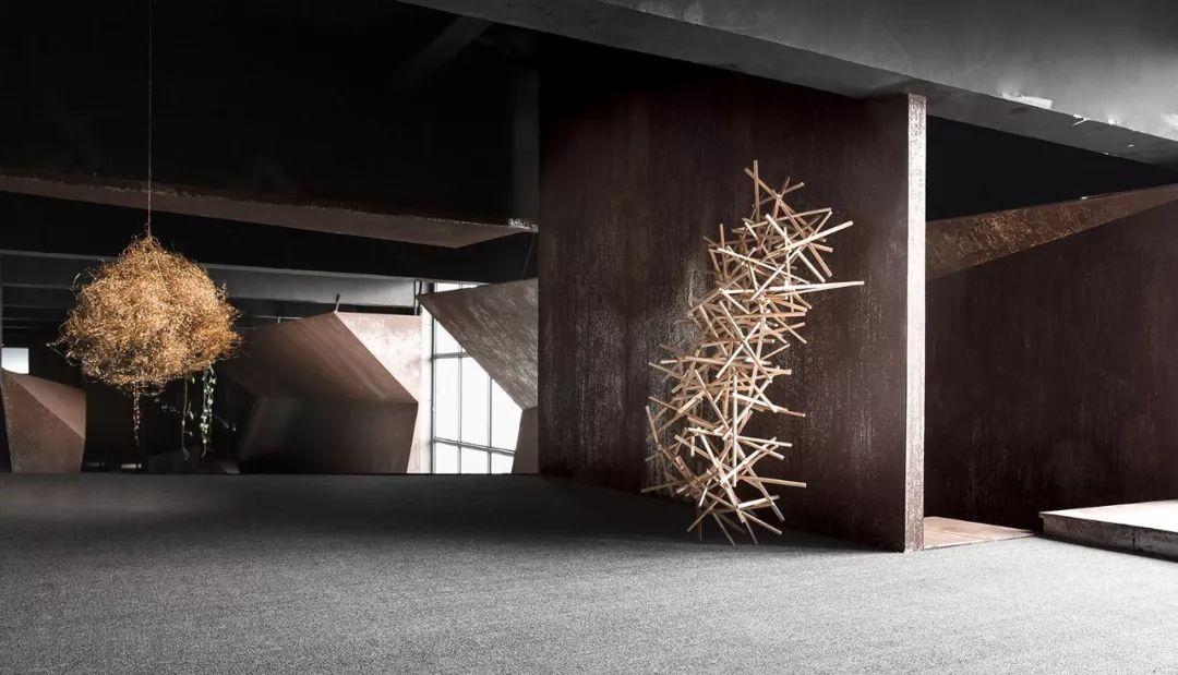 藝術(shù)裝置是這個(gè)空間里不可缺少的活力和思想的體現(xiàn),纏繞的金色鐵絲球,像思考著腦中繁雜多變的思路;根根堆疊看似毫無秩序的木條,卻奇異地平穩(wěn)搭建成一個(gè)高度的架構(gòu);行走著的人形裝置,永遠(yuǎn)朝著光的方向步履不停。