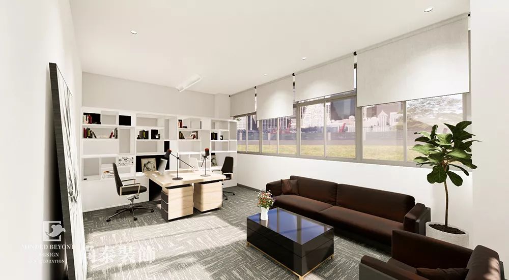 獨(dú)立辦公室作為一個(gè)領(lǐng)導(dǎo)式的空間,有了更多空間的同時(shí),也需要有一定的秩序。立體格子書架與辦公桌近距離放置,方便省事,和縱向擺放的長形沙發(fā)形成相交的關(guān)系,空間的秩序感和線條感進(jìn)一步加深。
