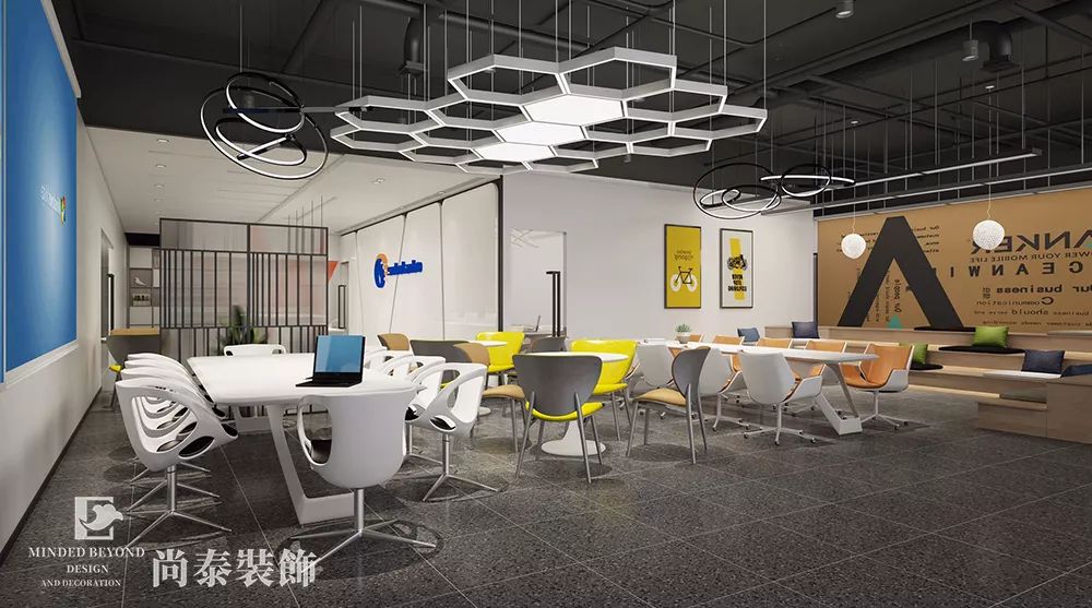 會議室休閑區(qū)設(shè)置了多種形式大小不一的討論空間,長方形、小圓桌、階梯教室形式的都被有序地置于同一個空間內(nèi),符合研發(fā)者開放、自由的精神,更是打破了一個空間只能有一個形式呈現(xiàn)的規(guī)律;再則是不同的會議空間采用不同樣式的吊頂,也讓空間呈現(xiàn)更加多樣化。