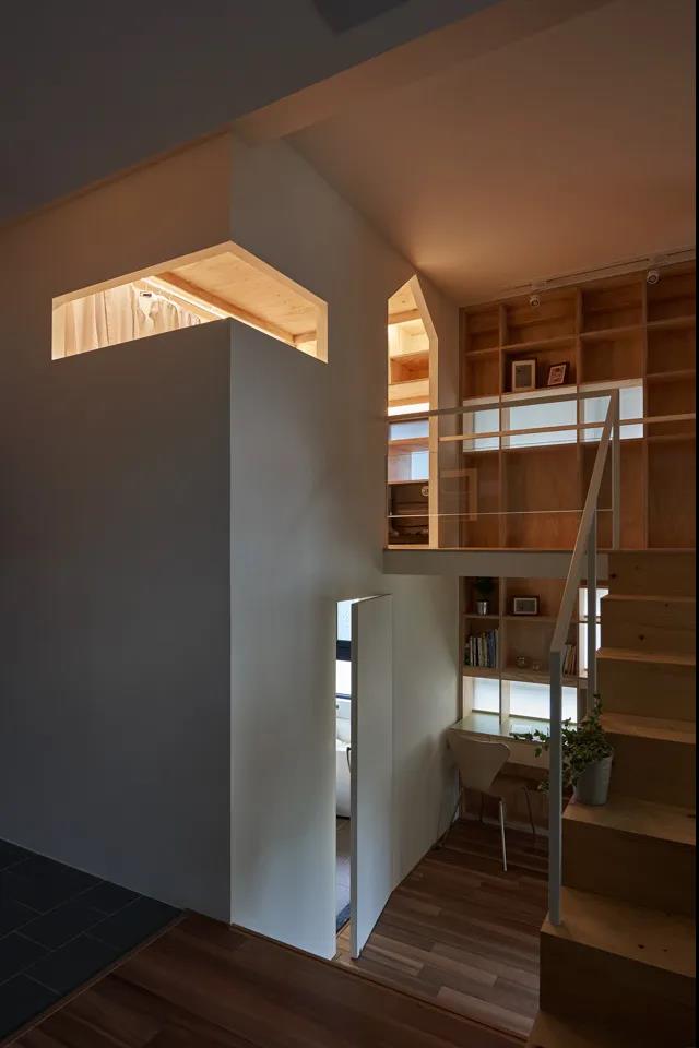試著將家里的樓梯間好好利用起來,可以成為像多功能房一樣的樓梯間辦公室,設(shè)計將原本的墻體制造成立體書架,并且很貼心地為了光照良好,設(shè)置成鏤空和實體拼接的樣式,這樣既可以放置物件又不妨礙辦公采光。