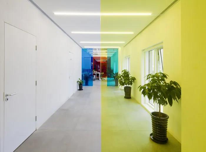 北京“廿一客”食品辦公室設(shè)計(jì),紅、黃、藍(lán)三色的玻璃將行走路徑面對(duì)或側(cè)旁的墻面填充,人們行走其間,不同的位置、角度都會(huì)造成不同顏色的玻璃疊加,形成另一種新的色彩空間,可以說是每一處角落都有發(fā)現(xiàn)驚喜的可能,空間的色彩認(rèn)知被不斷翻新。