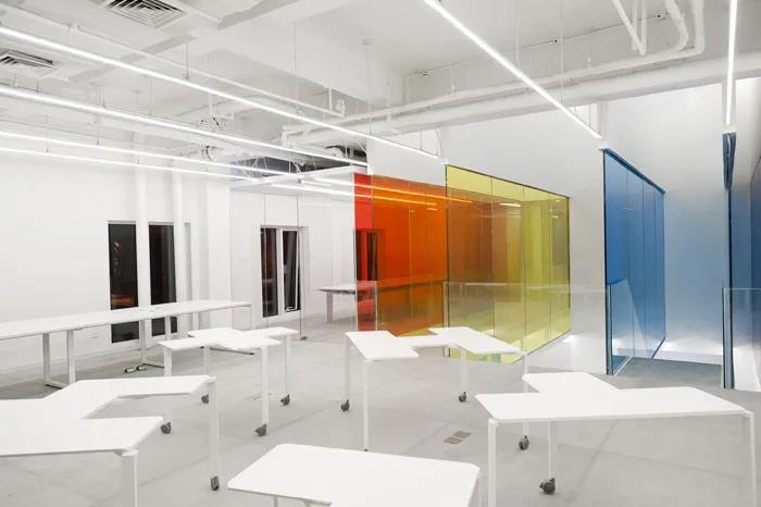 燈帶加上一片片的彩色玻璃,讓空間內(nèi)充滿了色彩和光線,此時(shí)的辦公室經(jīng)過魔術(shù)師的手,搖身一變成了未來感和科技感十足的光影空間!