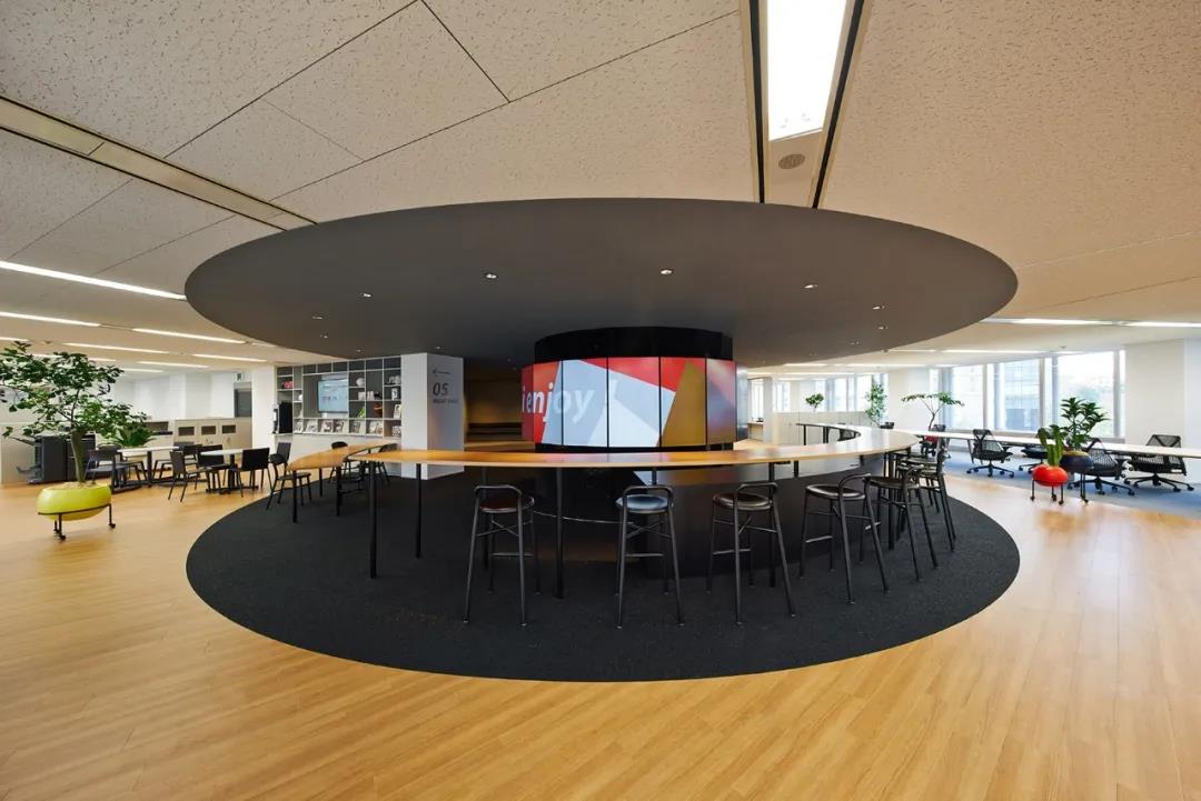 空間是一個統(tǒng)一體,是若干個彼此獨(dú)立又維系聯(lián)系的空間,構(gòu)成前后聯(lián)系、互有對比的空間環(huán)境。在該辦公室里,前有導(dǎo)向性和序列性的排列,后有中間的圓柱式空間,對比出項(xiàng)目的視覺中心,圓柱空間是休閑活動的集中地,也可以是統(tǒng)一的工作空間。