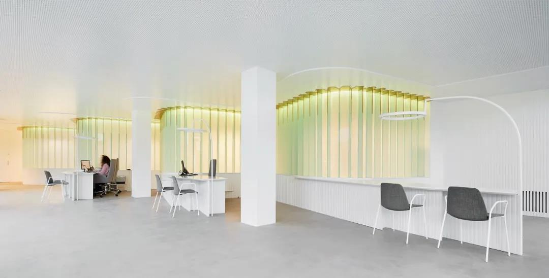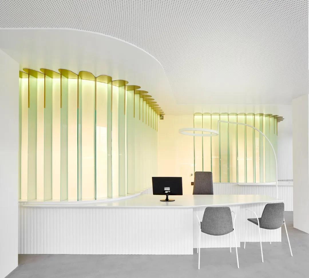 光屏由垂直排列在隔墻周圍的平滑玻璃板構(gòu)成,這種玻璃可以讓光線疊加,上面是金色的弧形裝飾物,像一片片向日葵的花瓣,在燈光的暈染下,讓人安心享受這里的寧靜與柔和。而這里的辦公桌設(shè)置,由光屏的基座展開,和曲面的光屏頂部平行,展現(xiàn)出更強的層次感,來訪者正是通過這樣連續(xù)而開放的,空間逐漸進入到辦公室的內(nèi)部。